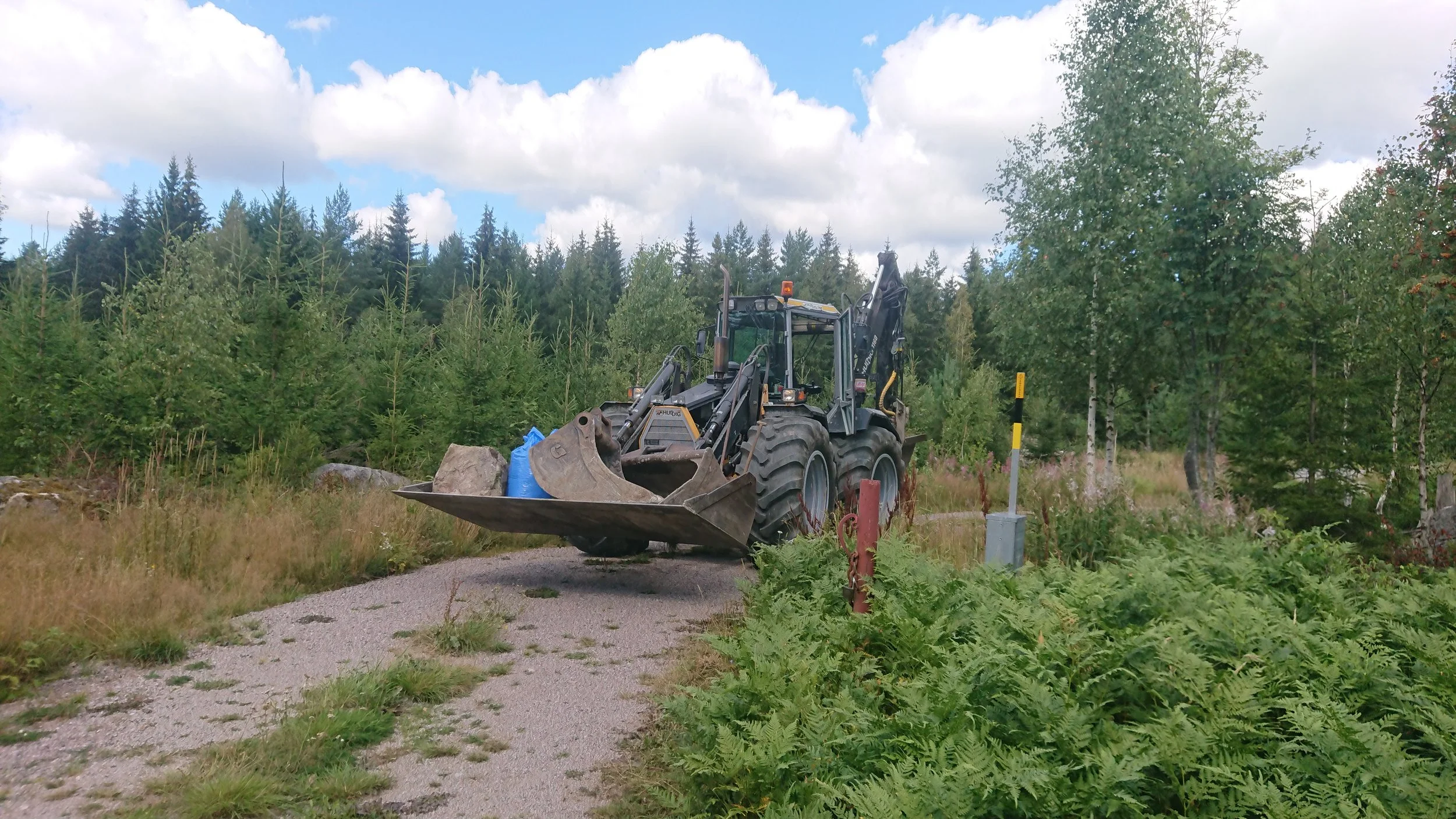 Vi gräver och slår dikeskanter med traktorgrävare. Den har bredare däck för att göra mindre åverkan på åkrar och känsliga marker.